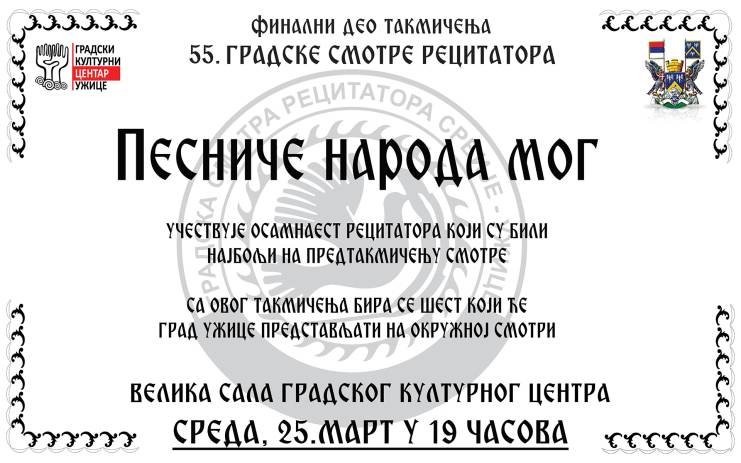 55.gradska Smotra recitatora ‘’Pesniče naroda mog’’ biće održana u sredu, 25.marta u Gradskom kulturnom centru. Takmičari, raspoređeni u 3 uzrasne kategorije, nadmetaće se za plasman u finalni deo Smotre koji će biti održan… […]