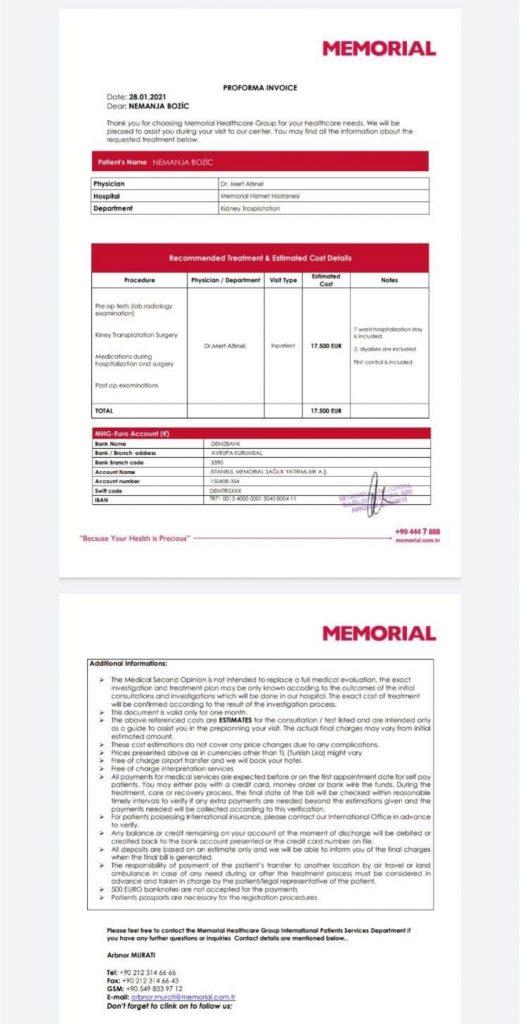 Nemanja ima 16 godina i ima ciste na bubrezima koja nalaže da je potrebna transplantacija bubrega koja treba da se obavi na klinici “Memorial” u Istambulu. Sama transplantacija košta 17,500 Eura uz dodatne troskove lečenja na ovoj klinici u kojoj ce Nemanja sa majkom, koja je inače donor bubrega, provesti najmanje 21 dan. Kako bi Nemanja nastavio da živi neomatano i bez tegoba koje trenutno ima molimo sve humane ljude dobre volje koji su u mogućnosti da pomognu koliko je to moguće kako bi Nemanja što pre nastavio da živi bez gore navedenih poteškoća. Donacije je moguće uplatiti putem ovih brojeva žiro računa: IBAN RS35205903102538234540 Unapred zahvalni: