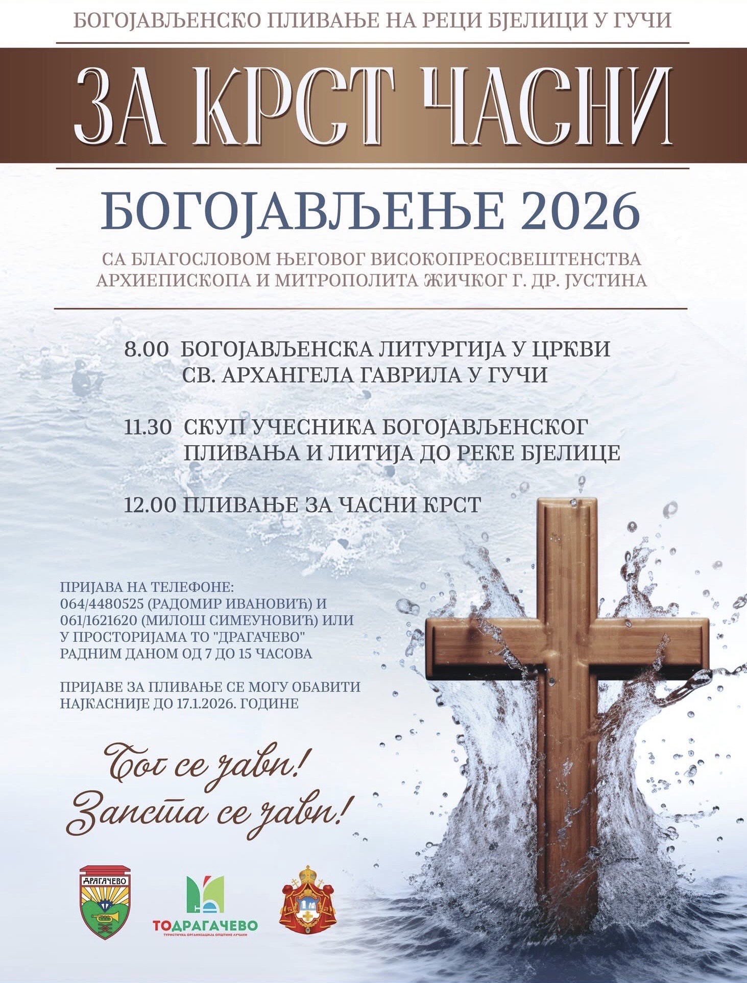 Ovogodišnje 16. tradicionalno plivanje za Bogojavljenski krst, pod pokroviteljstvom Grada Užica u organizaciji JP “Veliki park” i uz blagoslov SPC, održaće se u ponedeljak, 19. januara u 10 časova na Gradskoj plaži. Litija će krenuti u 9 časova i 30 minuta ispred crkve Svetog Đorđa. Zainteresovani učesnici se mogu prijaviti na na klizalištu na Trgu partizana od utorka 13. januara od 9 časova do petka 16. januara do 12 časova. Lekarski pregledi će se obavljati na Gradskoj plaži (splav), na dan održavanja manifestacije od 7 časova. Sve informacije zainteresovani mogu dobiti na broj telefona 065/521-73-73.