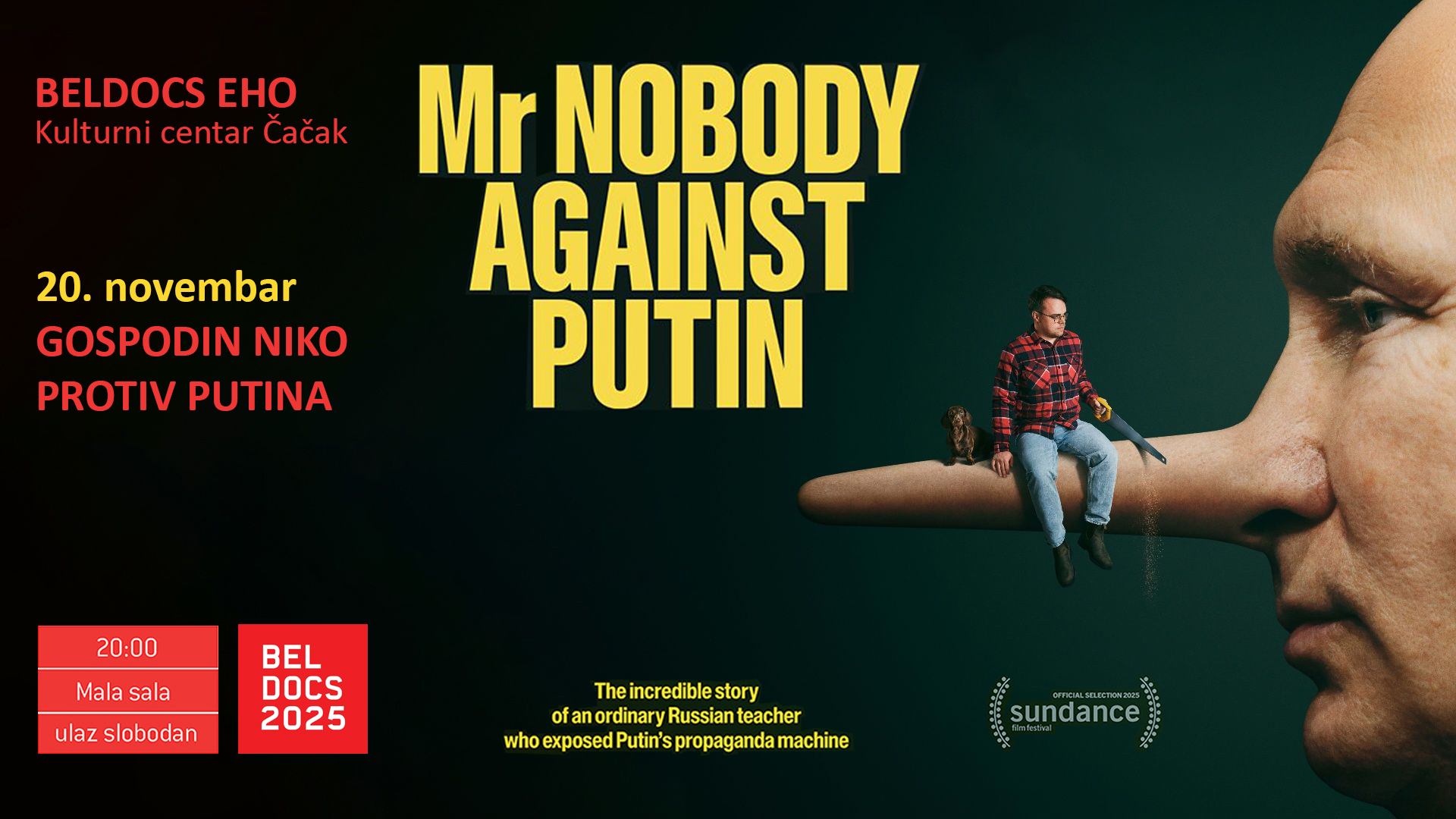 Revija filmova BELDOCS EHO sa međunarodnog festivala Beldocs u Kulturnom centru Čačak nastavlja se filmom Pavela Talankina i Davida Borenštajna GOSPODIN NIKO PROTIV PUTINA (Mr. Nobody Against Putin, Češka, Danska 2025, 90′). Pavel… […]