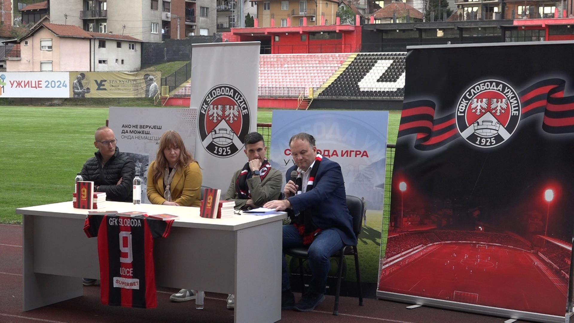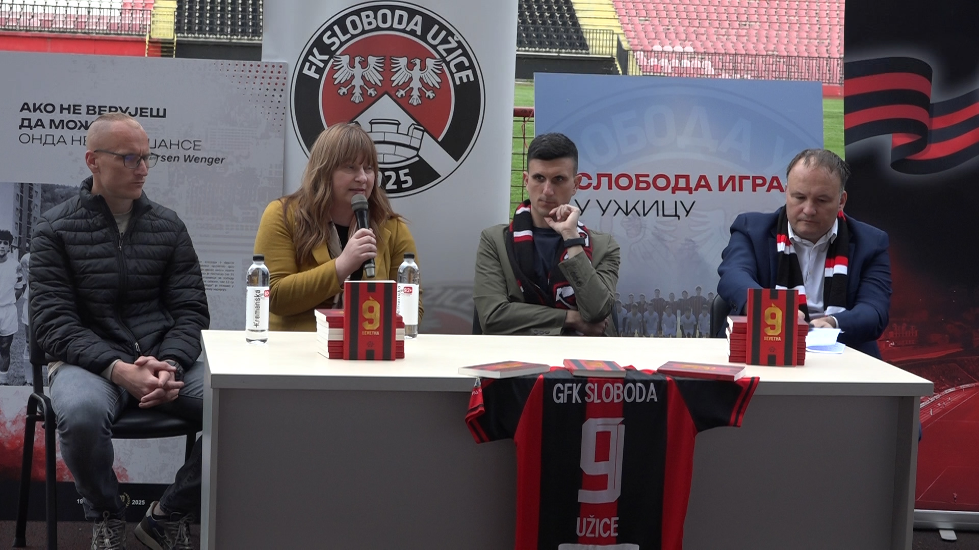 Na zapadnoj tribini stadiona Radomir Antić u Užicu je održana promocija romana “Devetka” autora Jovana Simića. Roman prati priču izmišljenog lika, Saše Golubovića koji uprkos velikom potencijalu ne uspeva da ostvari vrhunsku karijeru. Kroz njegovu sudbinu, autor pripoveda o talentu, pritiscima, pogrešnim odlukama i okonostima koje su ga odvele daleko od ostvarenja sna. Roman “Devetka” Jovana Simića izdvaja se kao jedinstveno sportsko delo koje u prvi plan stavlja unutršnji svet bivšeg fudbalera. Kroz fiktivni lik Saše Golubovića prikazana je složena priča o ličnim borbama, dok je radnja smeštena u Užice i Slobodu, što je povezano autorovima porodičnim korenima iz Rožanstva: -Devetka je prvi sportski roman koji je napisan na ovaj način na koji je napisan, zato što se bavi više unutrašnjim svetom bivšeg sportiste, ne samo nakon karijere, već i tokom karijere. Fudbal i sport su ovde samo jedna plaforma da se ispriča jedna mnogo dublja priča. Uzeto je Užice kao mesto dešavanja i Sloboda kao matični klub Saše Golubovića glavnog lika u romanu koji je ponikao u Slobodi i odatle otišao dalje u Francusku, u Monpelje gde je gradio karijeru i na žalost nije uspeo da je izgradi u punom obimu u kome je mogao, i trebao zbog nekih stvari koje i danas pogađaju sve mlade fudbalere. Jedna dublja priča koja se najviše bavi unutrašnjim svetom i psihologijom mladog čoveka kojem se brzo desi uspon, a nakon toga i pad- priča Simić. Simić je želeo da radnju smesti u Užice i baš u FK Slobodu, jer nije hteo da priču stavi u kontekst nekog beogradskog kluba, već da to upravo bude u unutrašnjosti: -Radi se o prvom slučaju romana koji za dominantnu temu ima jedan fudbalski klub, i jednog fudbalera iz tog kluba. Užičani imaju tu privilegiju da se radi o našem gradu i našem klubu. Takođe, imamo po prvi put promociju jednog književnog dela na Gradskom stadionu. Pored toga po prvi put imamo priliku da u jednom pre svega fikcionom romanu prikažemo Slobodu na jedan drugi način, kroz jednu izuzetno važnu i na žalost aktuelnu temu, a koja je priča o drugoj strani uspeha, o izazovima, na žalost i porocima koji vrlo često prate taj uspeh. Centralna tema romana je zapravo borba sa samim sobom. Jovan je sve to prikazao na jedan surovo realan- zaključio je Nešić.